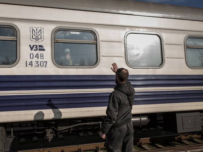 KRAMATORSK, UKRAINE - APRIL 6: A man waves at his relative after boarding a train as civilians are being evacuated from combat zones in Kramatorsk, Donetsk Oblast, in eastern Ukraine on April 6, 2022. Civilians search to board the first available train headed west. (Photo by Andrea Carrubba/Anadolu Agency via Getty Images) / Anadolu Agency