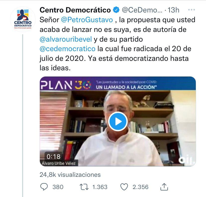 Lo que sucede es que esa propuesta fue una copia de una propuesta que ya había sacado el expresidente Álvaro Uribe. En el video pueden ver lo que dijo el exmandatario el 20 de julio de 2020, día en que se radicó la propuesta.