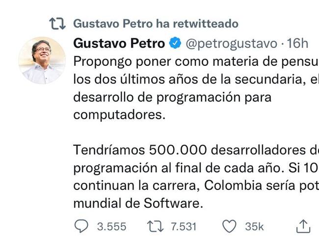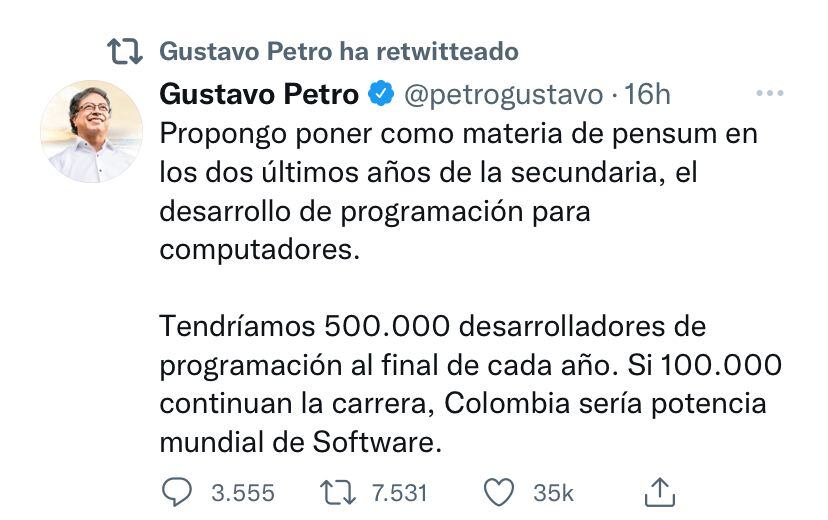 “Propongo poner como materia de pensum en los dos últimos años de la secundaria, el desarrollo de programación para computadores. Tendríamos 500.000 desarrolladores de programación al final de cada año. Si 100.000 continúan la carrera, Colombia sería potencia mundial de software”, expresó en su cuenta de Twitter.