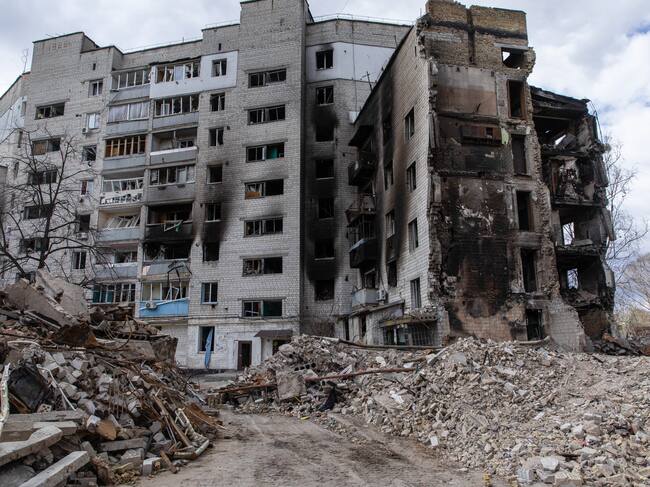 BORODYANKA, UKRAINE - 2022/04/12: Destroyed residential buildings seen in Borodyanka, Kyiv Oblast. The city of Borodyanka was destroyed by intense shelling by Russian forces. Ukraine's President Volodymyr Zelensky has warned that the situation in the town of Borodyanka, about 15 miles from Bucha, was "significantly more dreadful" than Bucha where there were high profile massacres of civilians. (Photo by Alex Chan Tsz Yuk/SOPA Images/LightRocket via Getty Images) / SOPA Images