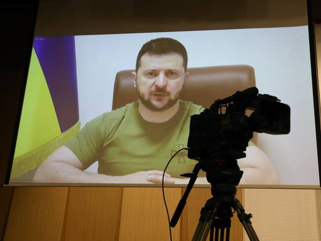 SEOUL, SOUTH KOREA - APRIL 11: Ukrainian President Volodymyr Zelensky addresses the South Korean parliament via video link at the National Assembly on April 11, 2022 in Seoul, South Korea. Zelensky has made a number of virtual appearances in recent weeks, lobbying foreign governments to help Ukraine defend itself against Russia's invasion. (Photo by Chung Sung-Jun/Getty Images) / Chung Sung-Jun