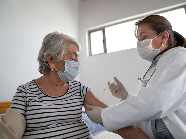 Latin American senior woman getting a COVID-19 vaccine by a doctor at a nursing home illness prevention concepts. Photo: Getty Images / Hispanolistic