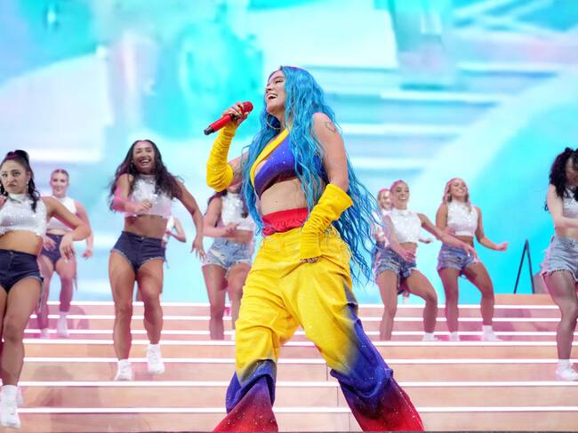 Durante su show, Karol G también lució un vestuario con los colores de la bandera de Colombia y antes de empezar a cantar la icónica canción ‘Como la flor’ de Selena, dijo: “estos son los colores de mi bandera. Soy de Colombia y me siento orgullosa de representarlos a ellos y a toda la comunidad latina”.