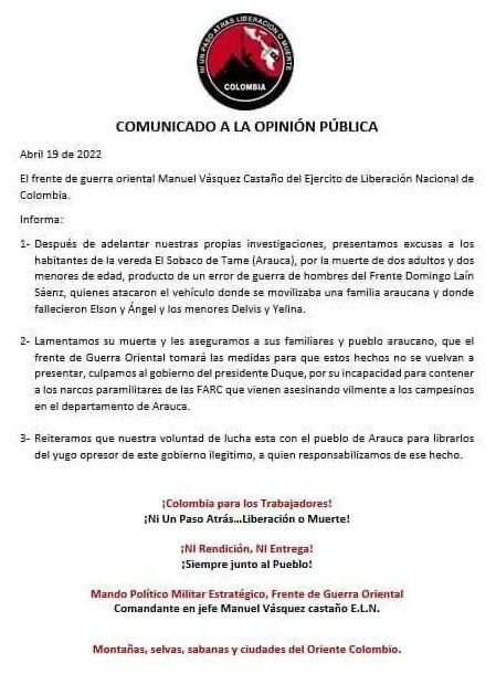 A través de un comunicado, el frente de guerra Oriental Manuel Vázquez Castaño del ELN reconoció como un error la muerte de las cuatro personas en la vereda El Sobaco, municipio de Tame, en Arauca.