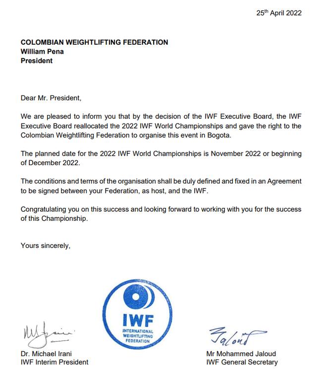 La Federación Internacional de Halterofilia (IWF) le otorgó a Bogotá la realización del Campeonato Mundial de Pesas en la categoría mayores, que se llevará a cabo entre noviembre y diciembre del presente año. El país ha sido protagonista en más de una ocasión en esta disciplina y ahora le llegó la hora de acoger un evento de esta magnitud, que tendrá a los mejores exponentes del mundo de la halterofilia en la capital de la República.