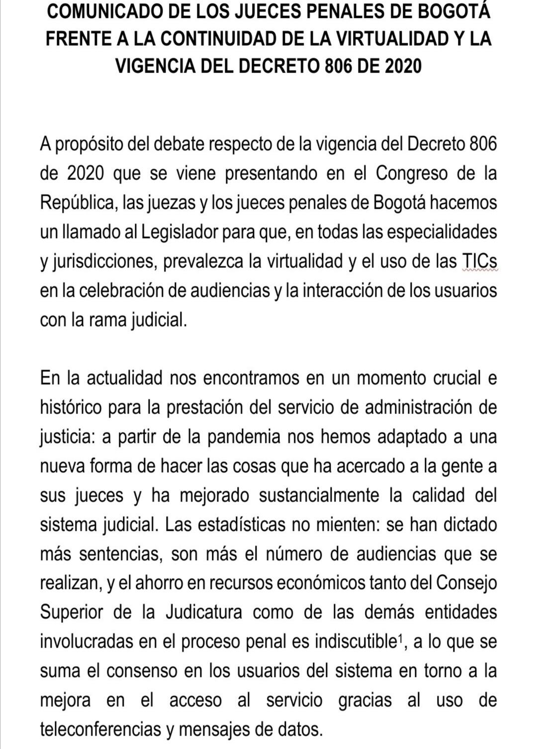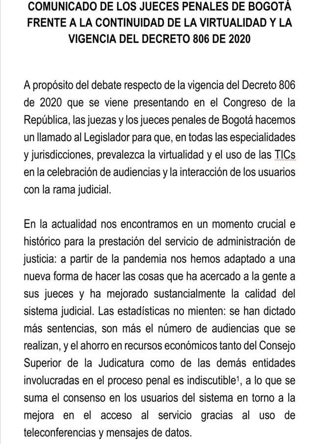 A través de un comunicado, los jueces penales de Bogotá, hicieron un llamado para que prevalezca el uso de la virtualidad en la celebración de audiencias.