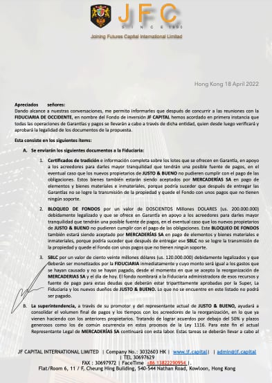 En medio de la audiencia que adelanta la Superintendencia de Sociedades por los incumplimientos en los pagos de deudas de Justo y Bueno, Nicolás Polanía, apoderado de Justo & Bueno, señaló que durante el fin de semana “obtuvo aprobación para poder radicar en el expediente una manifestación escrita donde los inversionistas (JF Capital) hacen unos compromisos muy concretos en el desarrollo de la inversión e incluso se refieren a que se haga una verificación del proceso por parte de la superintendencia de sociedades”.