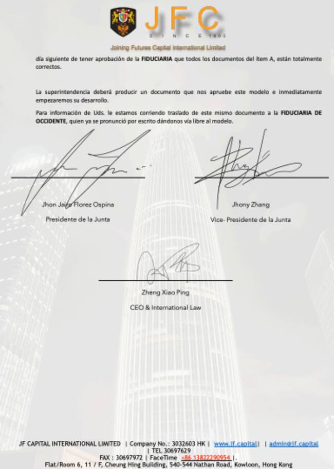Este lo firman Jhon Jairo Flórez Ospina, presidente de la Junta, el colombiano que está detrás del fondo, como lo reveló esta emisora; Jhony Zhang, vicepresidente de la Junta y Zheng Xiao Ping CEO & International Law.