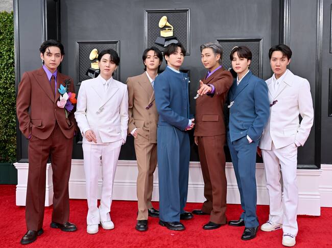 LAS VEGAS, NEVADA - APRIL 03: (L-R) V, Suga, Jin, Jungkook, RM, Jimin and J-Hope of BTS attends the 64th Annual GRAMMY Awards at MGM Grand Garden Arena on April 03, 2022 in Las Vegas, Nevada. (Photo by Axelle/Bauer-Griffin/FilmMagic) / Axelle/Bauer-Griffin