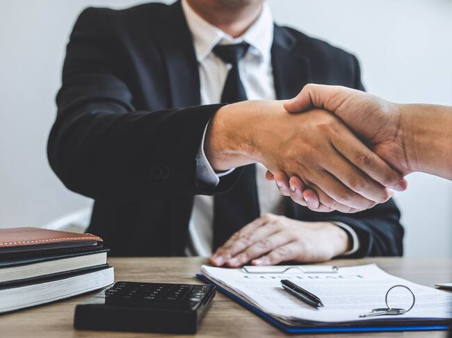 Finishing to successful deal of real estate, Broker and client shaking hands after signing contract approved application form, concerning mortgage loan offer for and house insurance. / Ngampol Thongsai / EyeEm
