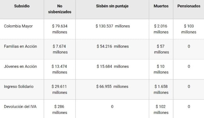 Dicho comunicado indica que hubo giros por $267.393 millones “a personas inscritas en el Sisbén, pero que no tenían el puntaje para recibir las ayudas de los cinco programas del Gobierno”.