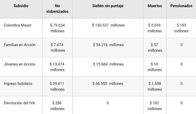 La información sobre cada uno de los beneficiarios que recibió los pagos sin cumplir los requisitos de los distintos subsidios otorgados por el Gobierno, la confirmó la data del Departamento para la Prosperidad Social y fue contrastada con más fuentes, entre otras, Colpensiones y el Sisbén IV.