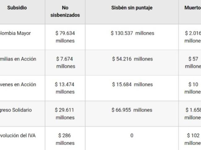 Dicho comunicado indica que hubo giros por $267.393 millones “a personas inscritas en el Sisbén, pero que no tenían el puntaje para recibir las ayudas de los cinco programas del Gobierno”.