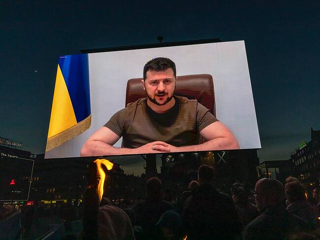 COPENHAGEN, DENMARK - MAY 04: To commemorate Danish World War II Liberation Day, Danes traditionally place candles by their windows, this year Ukrainian President Zelensky addresses Danes via video projected on large screens at Copenhagen City Hall Square. (Photo by Ole Jensen/Getty Images) / OLE JENSEN