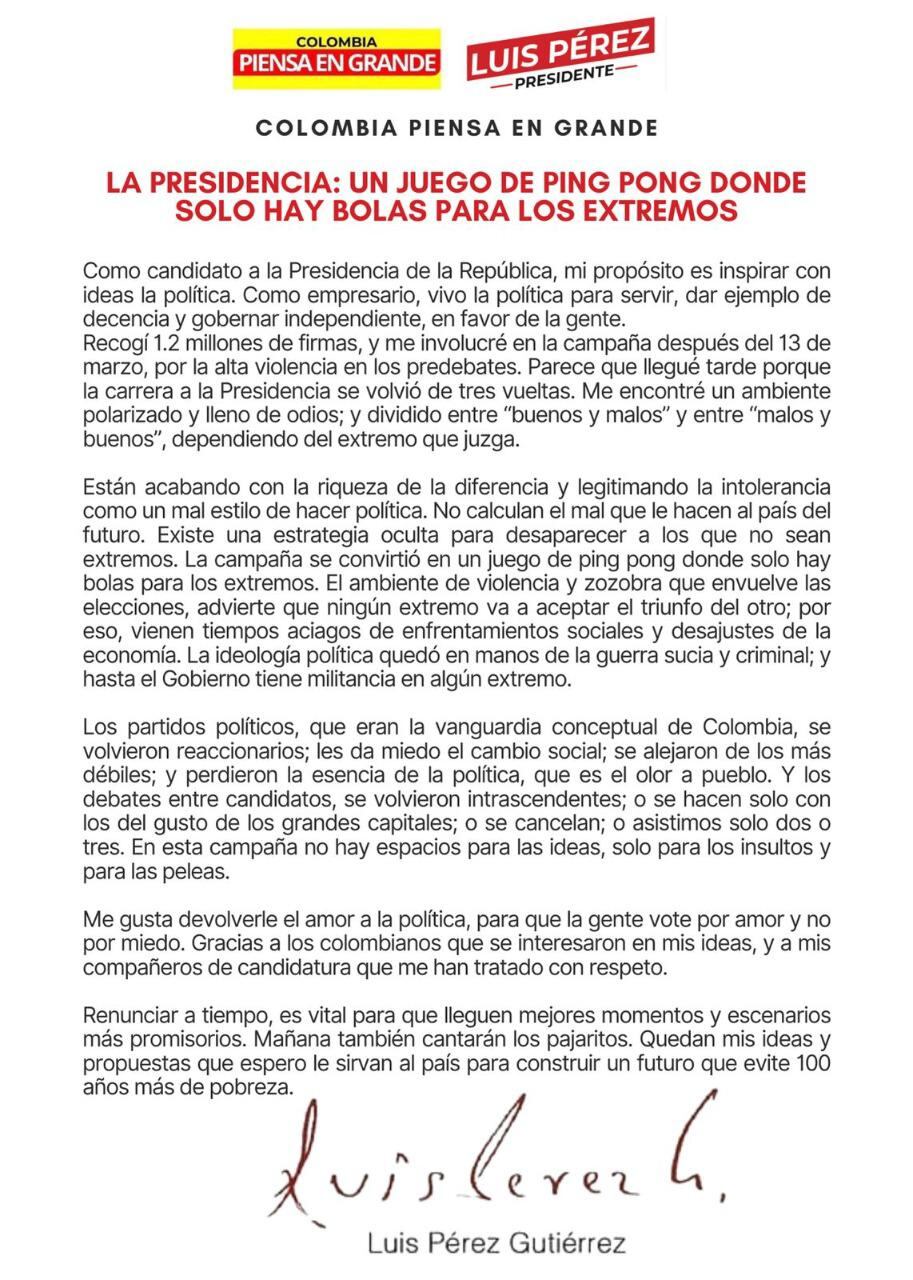 El exgobernador de Antioquia, Luis Pérez, renunció a su candidatura y le hizo duras críticas a la contienda electoral.