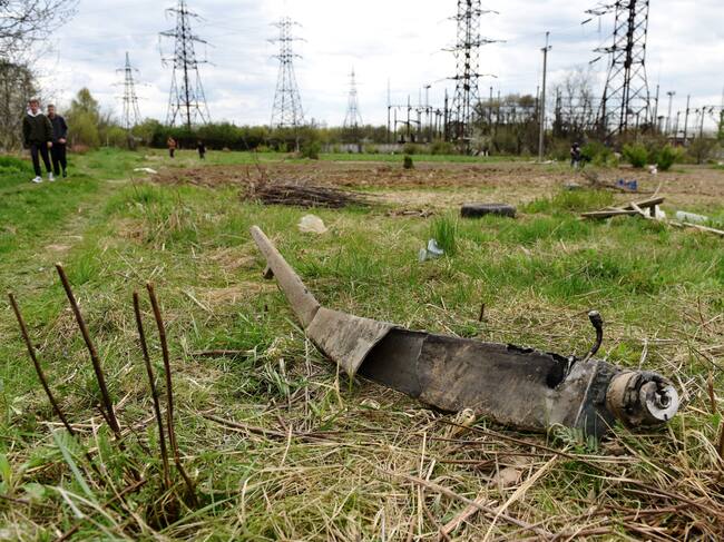 TOPSHOT - People pass by a missile fragment next to a power substation damaged following a missile strike in the western Ukrainian city of Lviv on May 4, 2022, as Russia's defence ministry said that its air- and sea-based weapons have destroyed six electrical substations near railways including around Lviv. (Photo by Yuriy Dyachyshyn / AFP) (Photo by YURIY DYACHYSHYN/AFP via Getty Images) / YURIY DYACHYSHYN