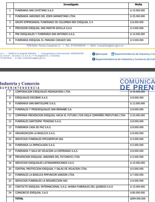 La Superintendencia de Industria y Comercio impuso multas a 24 prestadores de servicios funerarios, por 294 millones de pesos al infringir el régimen de protección al consumidor.