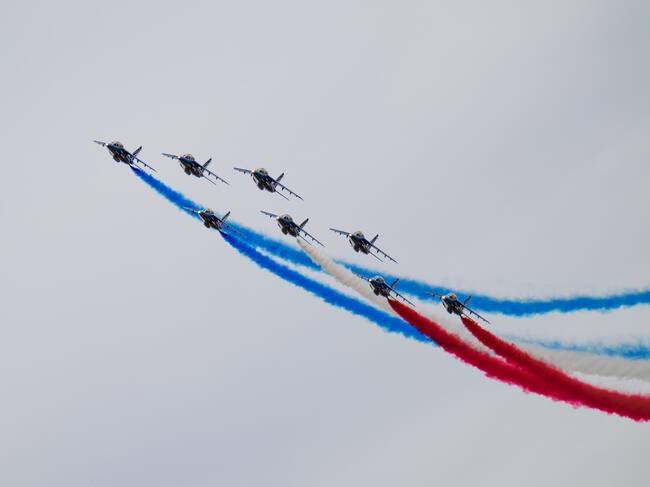 Ocho aviones de la Patrulla Aérea francesa -un grupo acrobático del ejército- sobrevolaron el Palacio de Festivales de Cannes y dibujaron en el aire la bandera francesa, como colofón al desfile por la alfombra roja de Tom Cruise y el resto del equipo de ‘Top Gun: Maverick’.