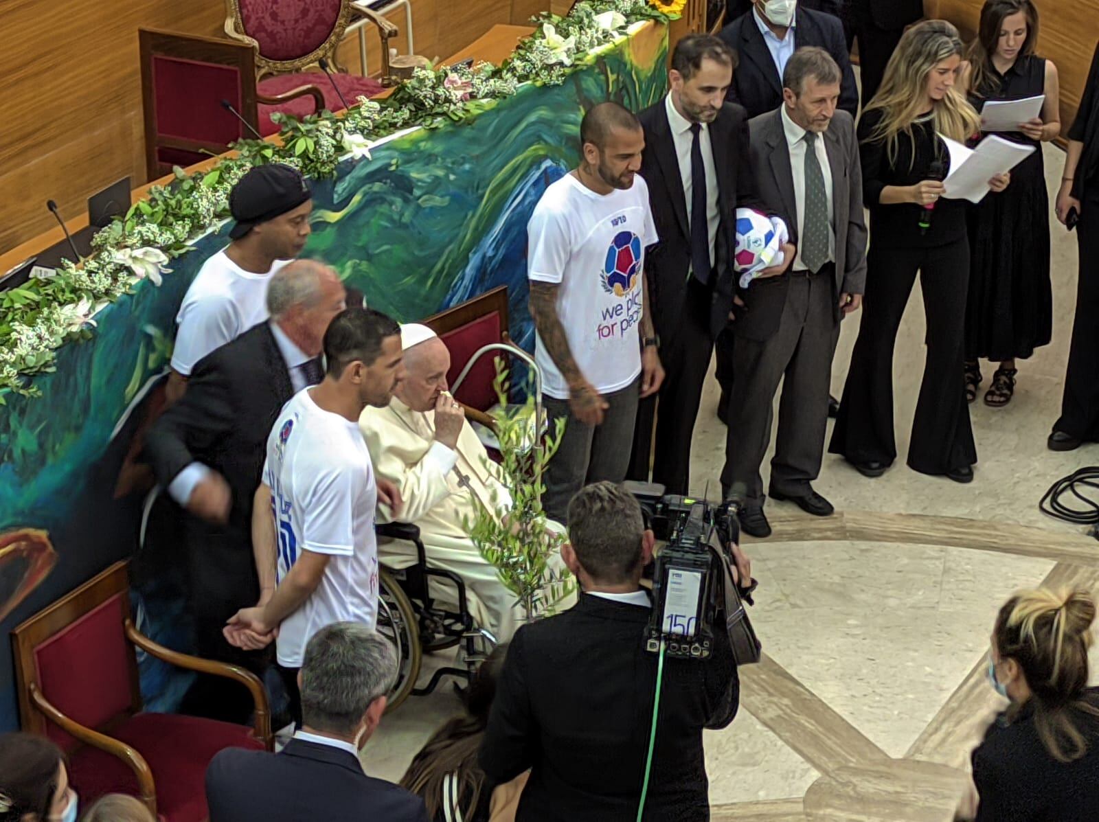 Finalmente, los futbolistas Dani Alves, Ronaldinho, Maxi Rodríguez participaron como figuras del deporte para apoyar la iniciativa de Scholas del partido por la paz que se celebrará en el Estadio Olímpico de Roma el próximo 10 de octubre y que será, entre otras cosas, un homenaje al fallecido Diego Armando Maradona.
