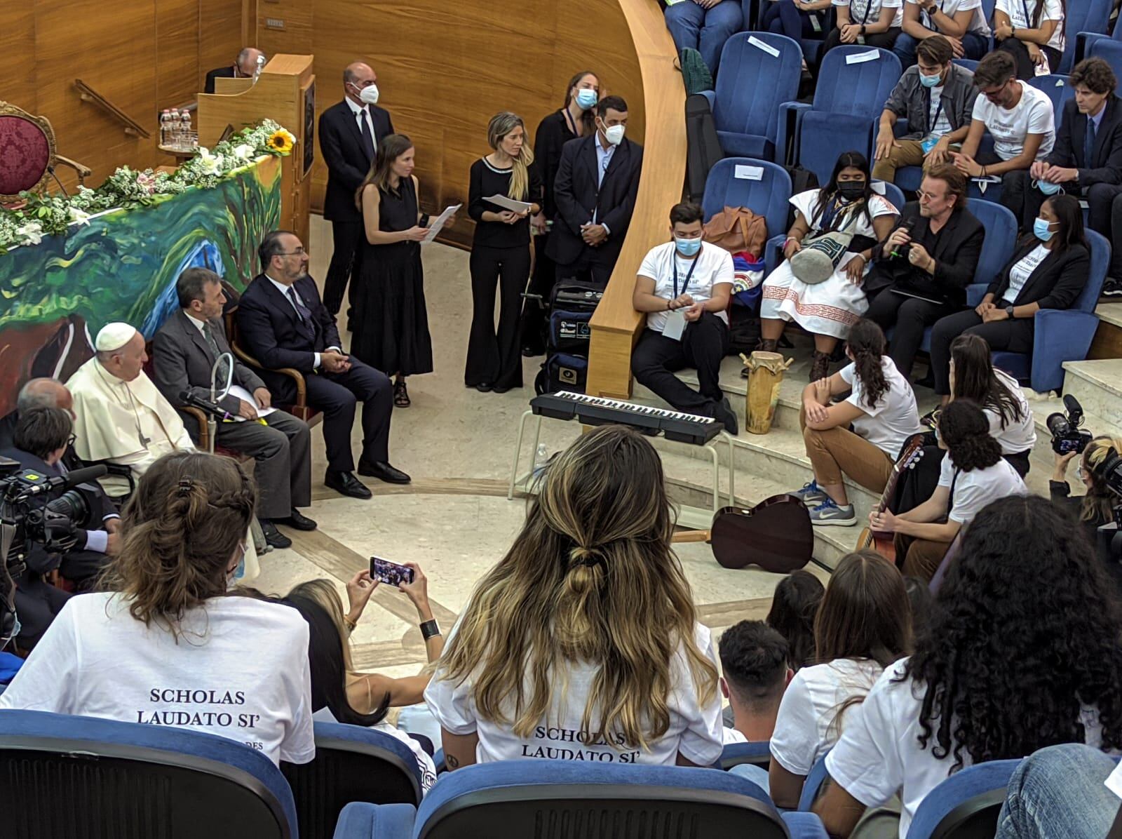 El papa Francisco inauguró este jueves la llamada Escuela Laudato Si, un proyecto que anima a jóvenes de todo el mundo a proteger el medioambiente, en un acto celebrado en Roma al que asistieron el líder de U2, Bono Vox, y los futbolistas Dani Alves, Ronaldinho, Maxi Rodríguez.