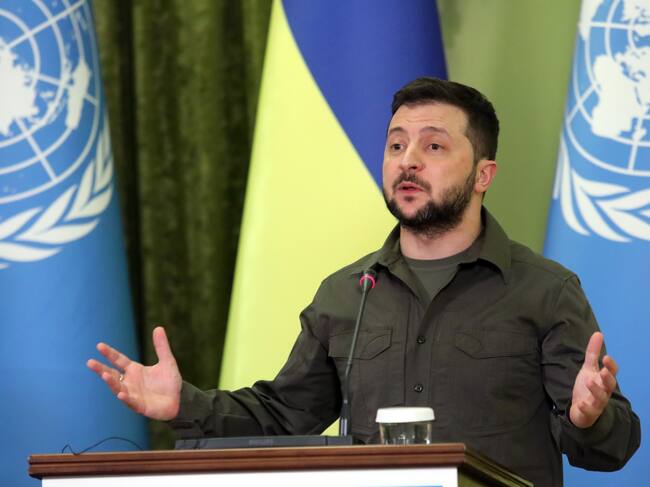 KYIV, UKRAINE - APRIL 28, 2022 - President of Ukraine Volodymyr Zelenskyy is pictured during a joint press conference with UN Secretary-General Antonio Guterres in Kyiv, capital of Ukraine. (Photo credit should read Volodymyr Tarasov/ Ukrinform/Future Publishing via Getty Images) / TARASOV