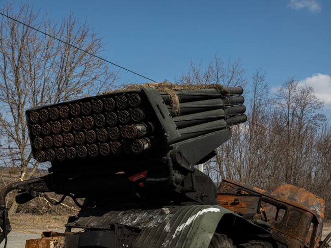 Un vehículo ruso MLRS (sistema de cohetes de lanzamiento múltiple) destruido con la munición se ve en el Óblast de Kiev. (Photo by Alex Chan Tsz Yuk/SOPA Images/LightRocket via Getty Images) / SOPA Images
