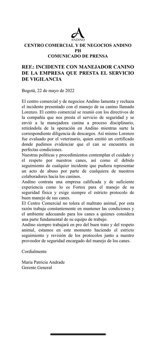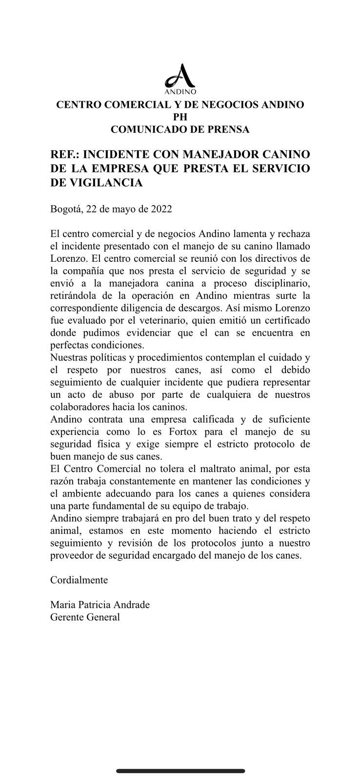 Por su parte, el Centro Comercial Andino emitió un comunicado rechazando lo sucedido y explicando que la mujer, guarda de seguridad, fue enviada a proceso disciplinario y retirada de su cargo mientras “surte la correspondiente diligencia de descargos”.