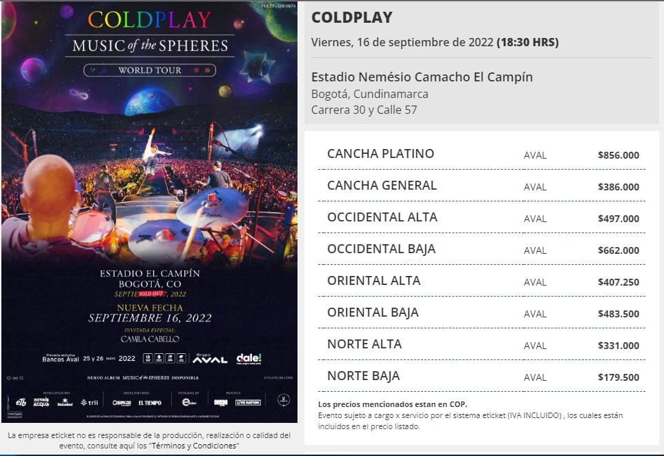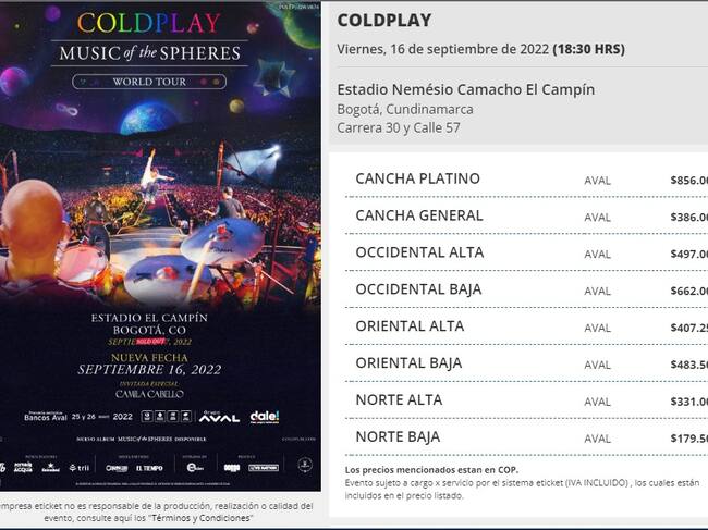 Precios boletería del concierto de Coldplay el 16 de septiembre.
