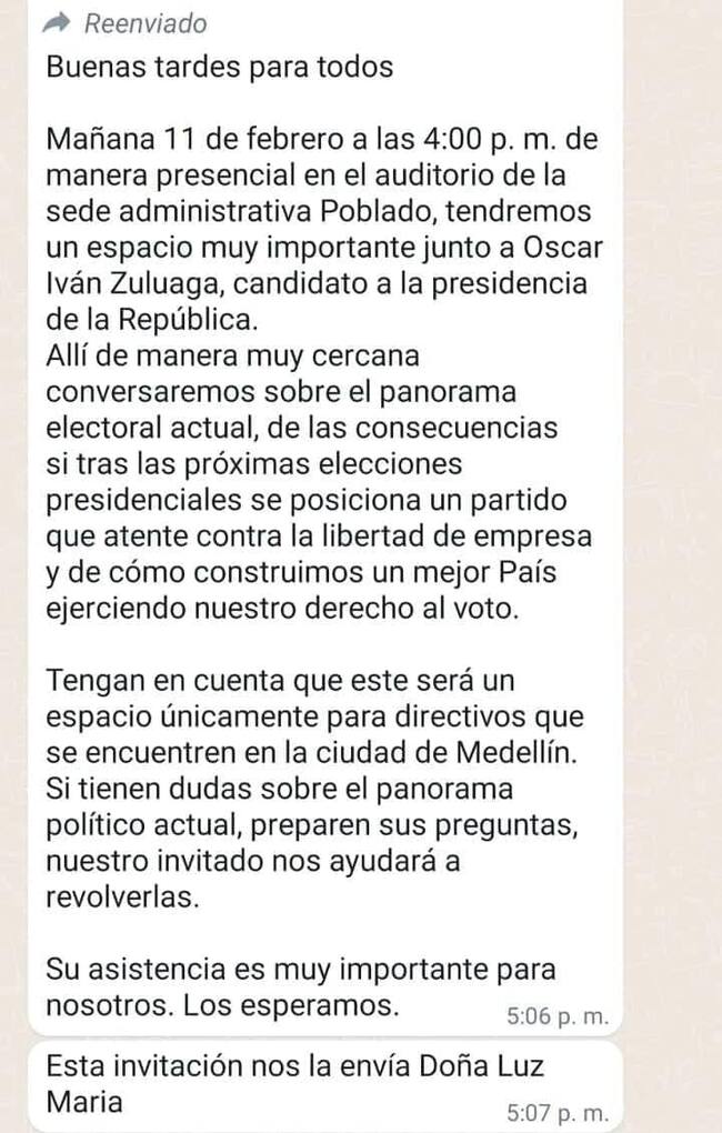 W Radio consultó a la compañía, quien a través de su vicepresidenta Jurídica y de Relaciones Corporativas, Luz María Gonzales de Bedout, aseguró que nunca se ha obligado a los trabajadores a ir a las charlas, ni que tampoco se ha exigido que voten por algún candidato en especial.