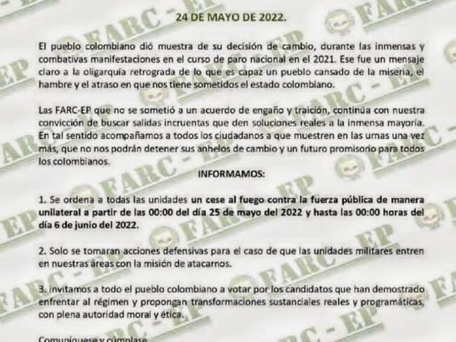 Las disidencias de las Farc informaron a través de un comunicado que circula en el departamento del Cauca que dieron la orden a sus unidades en todas las localidades donde tienen presencia, de mantener un cese al fuego unilateral desde hoy 25 de mayo hasta el próximo seis de junio, en el marco de las elecciones presidenciales a desarrollarse el domingo 29 de mayo.