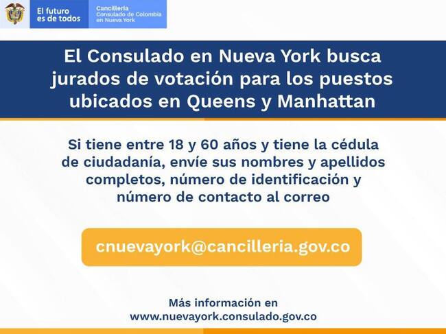 En el marco de las elecciones presidenciales anticipadas, el Consulado de Nueva York hizo un llamado a los colombianos para que participen voluntariamente como jurados de votación para los puestos de Queens y Manhattan.