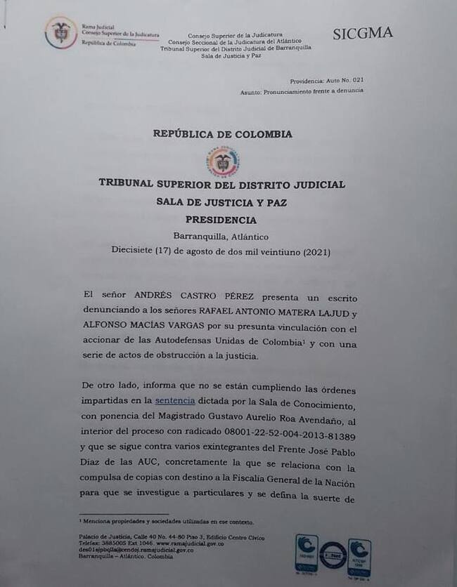 Después de que el exparamilitar Salvatore Mancuso, rindiera sus declaraciones ante el Tribunal de Justicia y Paz de Barranquilla, sobre las acciones que ejecutó el extinto frente José Pablo Díaz de las Autodefensas Unidas de Colombia, AUC y en las que aseguró la presunta participación que habrían tenido varios empresarios, volvió a ponerse en el foco de la situación una denuncia en la que también se mencionan los nombres de los involucrados.