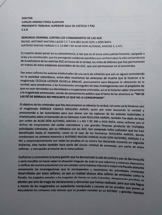 “El objeto de los criminales que hoy denunciamos es silenciar la verdad tal como ya lo hicieron con el magistrado Enrique Camilo Noguera Aaron, quien por estar buscando la verdad y presionando a las autoridades para que dieran con las capturas de los autores materiales e intelectuales sobre el homicidio de su hermano Juan Noguera Aaron, también fue dado de baja por orden de alias ‘Don Alfonso’, ‘Macias 1′ o ‘M1′ y de ‘300′ o ‘Don Rafa”, se lee en la denuncia.