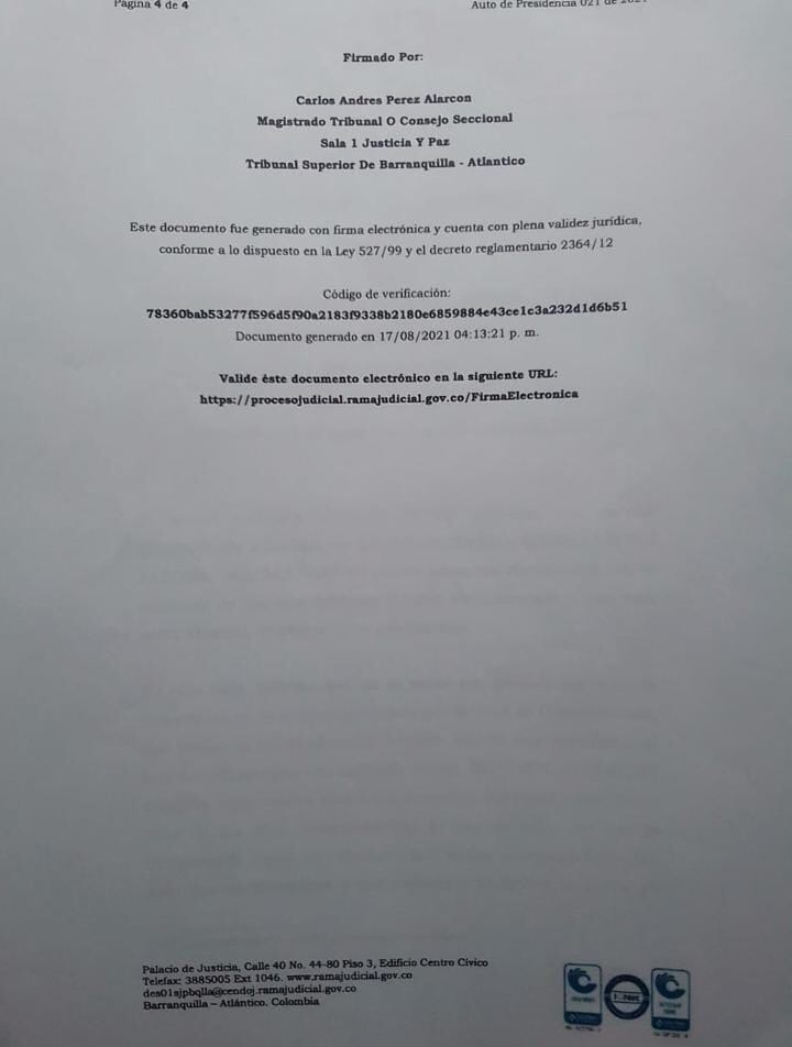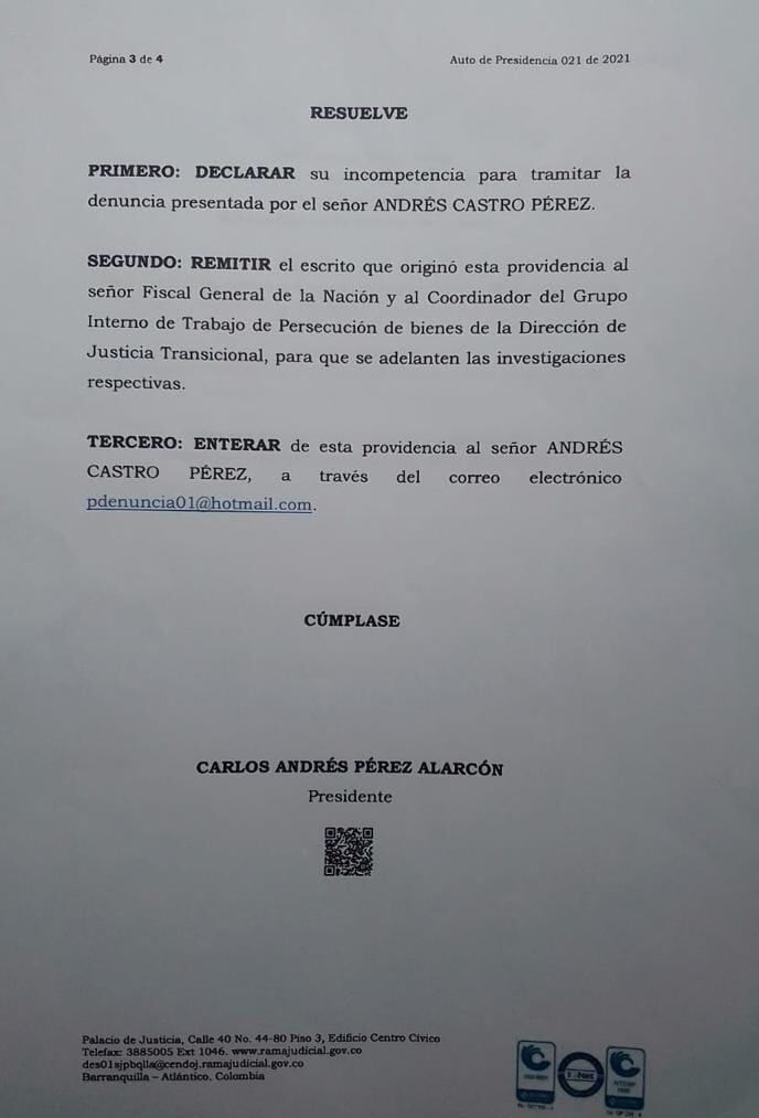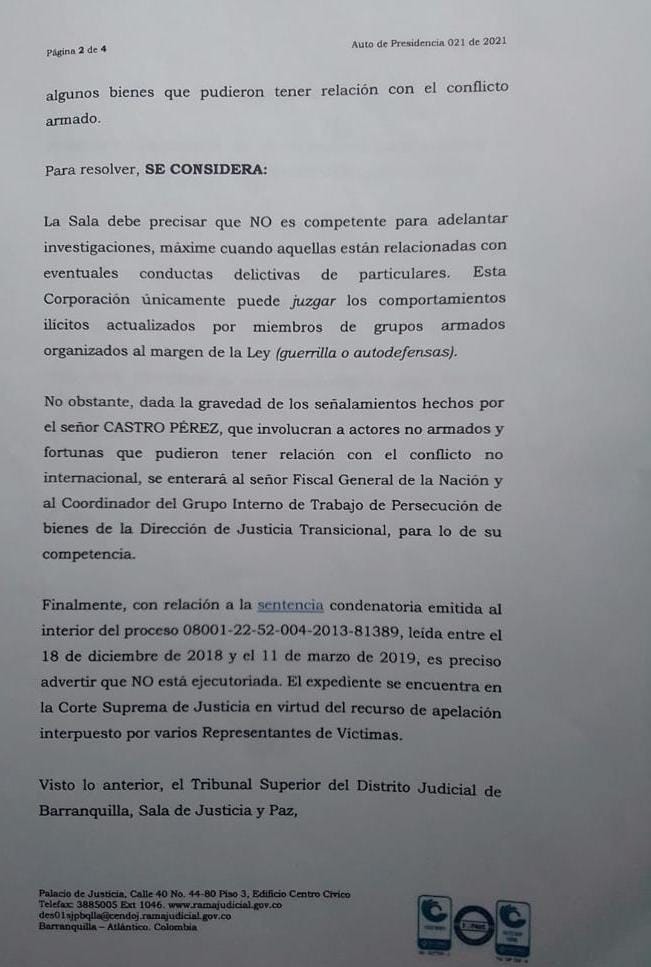 “No obstante, dada la gravedad de los señalamientos hechos por el señor Castro Pérez, que involucran a actores no armados y fortunas que pudieron tener relación con el conflicto no internacional, se entregarán al señor Fiscal General de la Nación y al Coordinador del Grupo Interno de Trabajo de Persecución de bienes de la Dirección de Justicia Transicional, para lo de su competencia”, señaló el auto del Tribunal.