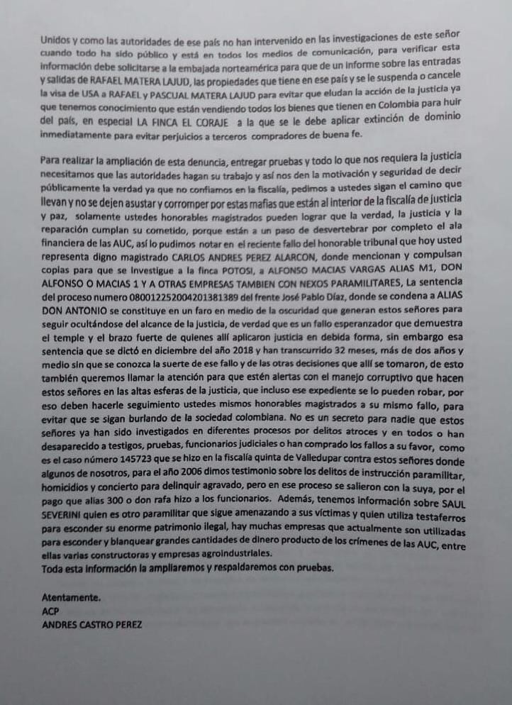 Por su parte, en su denuncia, el ciudadano realizó graves señalamientos contra los empresarios, en los que los califica como autores intelectuales de crímenes e incluso, de amenazar de muerte a la magistrada Cecilia Leonor Olivella con el fin, según el documento, de bloquear las investigaciones y que sus identidades no fueran reveladas.