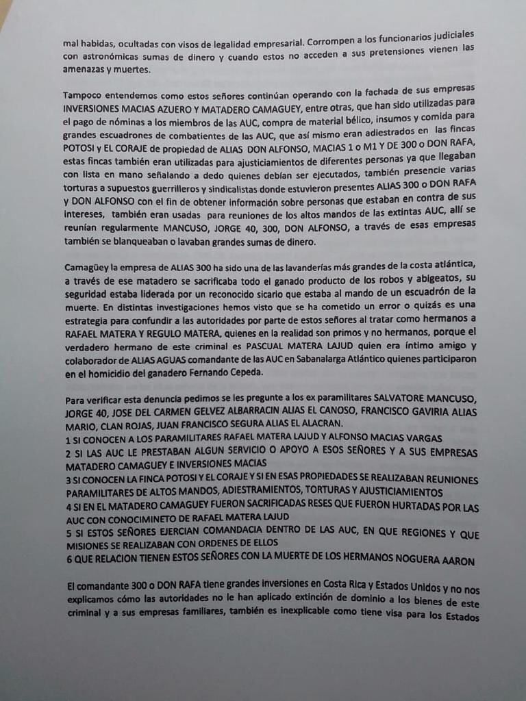 “El objeto de los criminales que hoy denunciamos es silenciar la verdad tal como ya lo hicieron con el magistrado Enrique Camilo Noguera Aaron, quien por estar buscando la verdad y presionando a las autoridades para que dieran con las capturas de los autores materiales e intelectuales sobre el homicidio de su hermano Juan Noguera Aaron, también fue dado de baja por orden de alias ‘Don Alfonso’, ‘Macias 1′ o ‘M1′ y de ‘300′ o ‘Don Rafa”, se lee en la denuncia.