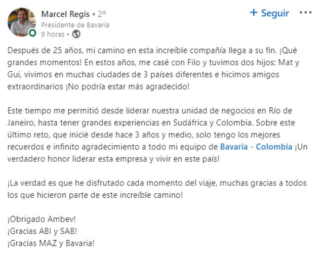 A ello agregó que “este tiempo me permitió desde liderar nuestra unidad de negocios en Río de Janeiro, hasta tener grandes experiencias en Sudáfrica y Colombia. Sobre este último reto, que inicié desde hace 3 años y medio, solo tengo los mejores recuerdos e infinito agradecimiento a todo mi equipo de Bavaria - Colombia ¡Un verdadero honor liderar esta empresa y vivir en este país!”, escribió a través de LinkedIn.