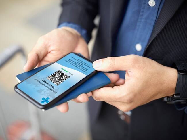 Midsection of businessman having online Covid-19 Immunization Certificate with passport. Male executive is using smart phone at airport. Traveling information is displayed on device screen. / Morsa Images