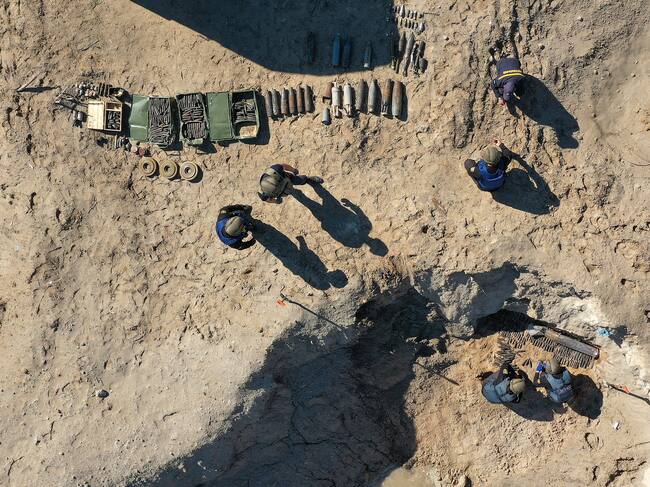 BORODIANKA, UKRAINE - JUNE 3: Bomb disposal experts from the Ukrainian State Emergency Service prepare for a controlled explosion of 1 ton of unexploded missiles, artillery shells and mines that they have retrieved during the last week in the Borodianka area on June 03, 2022 in Borodianka, Ukraine. The demining and clearing of unexploded ordnance in Ukraine after the Russian invasion could take between 5-7 years, in the Kyiv region alone they have already removed over 36,000 items of dangerous ordnance. (Photo by Christopher Furlong/Getty Images) / Christopher Furlong