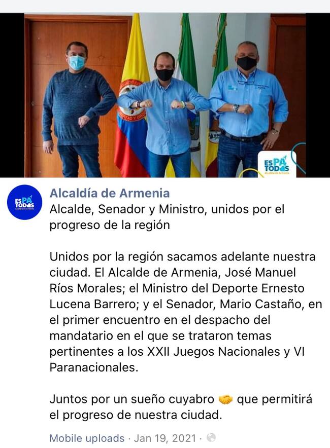 En una imagen en el Facebook de la Alcaldía de Armenia, el alcalde de la ciudad posa junto con el ministro del Deporte del momento, Ernesto Lucena y el recién capturado senador Mario Castaño.