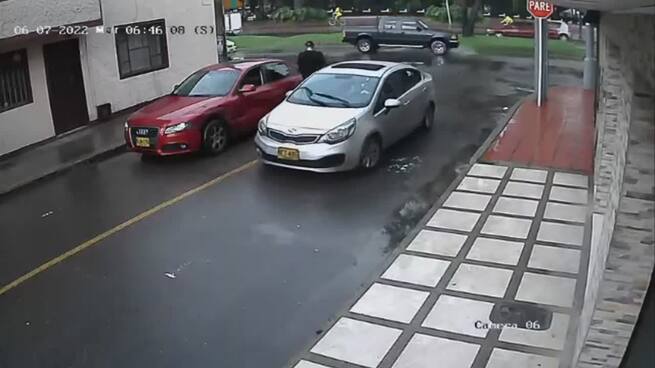En el video se ve cómo un vehículo rojo esta parqueado sobre la vía, y segundos después llega otro carro de color gris que parquea en ese mismo punto. En ese momento, desciende un hombre vestido con prendas azules, que posteriormente simula estar orinando en la calle.