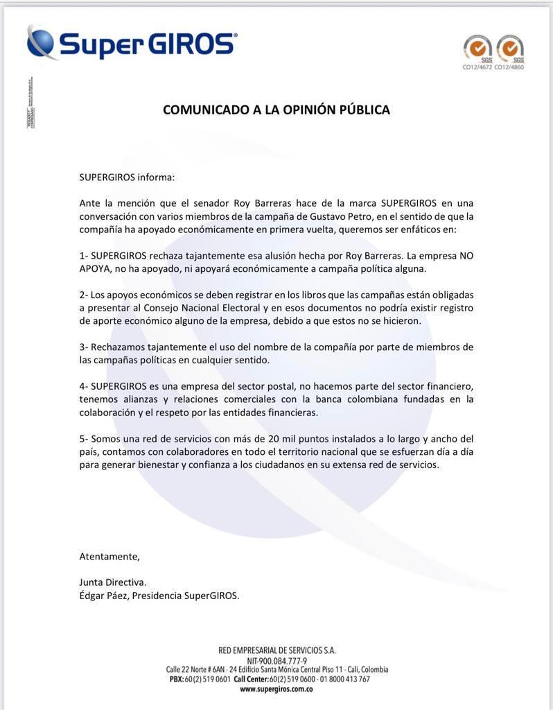 Supergiros se pronunció frente a la mención que el senador Roy Barreras hizo de esta marca en una conversación con varios miembros de la campaña de Gustavo Petro, en la que señaló que Supergiros apoyó económicamente a Gustavo Petro en primera vuelta.