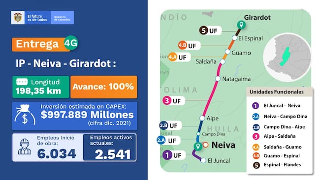 El proyecto Neiva – Espinal – Girardot es el octavo del programa de Cuarta Generación que se entrega por parte del Gobierno Nacional, sumándose así a las entregas ya realizadas de Girardot-Honda-Puerto Salgar, Circunvalar de la Prosperidad, Puerta de Hierro-Palmar de Varela y Carreto-Cruz del Viso, Pacífico 2, Transversal del Sisga, Vías del Nus y Mar 1.