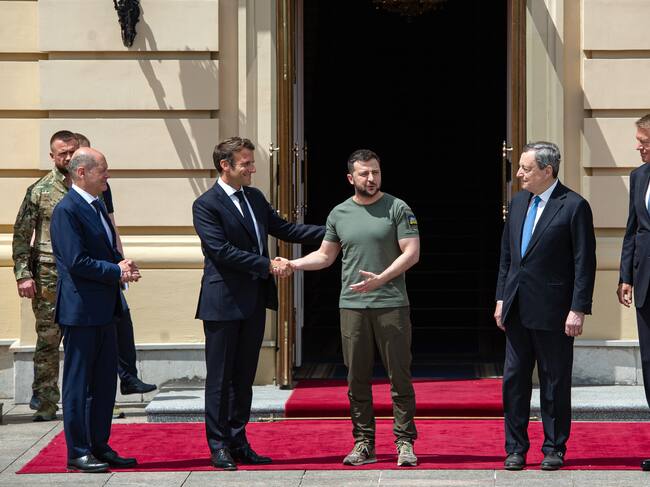 KYIV, UKRAINE - JUNE 16: Ukrainian President Volodymyr Zelensky shakes hands with France's President Emmanuel Macron as German Chancellor Olaf Scholz, Italian Prime Minister Mario Draghi and Romanian President Klaus Iohannis look on June 16, 2022 in Kyiv, Ukraine. The leaders made their first visits to Ukraine since the country was invaded by Russia on February 24th. (Photo by Alexey Furman/Getty Images) / Alexey Furman