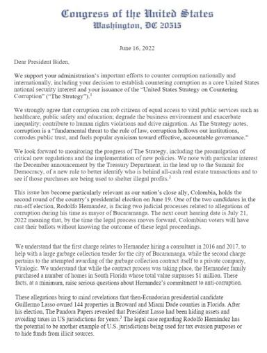 Carta enviada por congresistas de Estados Unidos sobre Rodolfo Hernández. Foto: Yari Adrian.