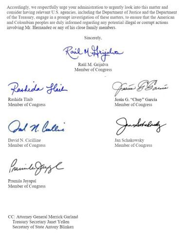La carta fue firmada por Rashida Tlaib, David Cicilline, Jesús García, Jan Schakowsky, Pramila Jayapal y Raúl Grijalva, quienes hacen parte de la Cámara de Representantes.