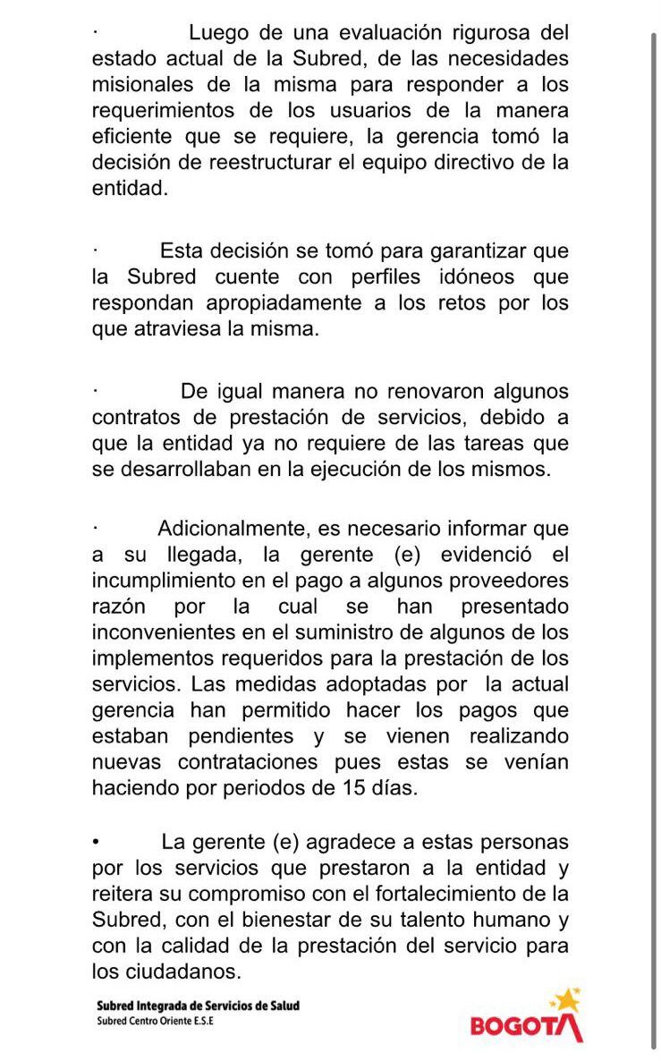 Vea a continuación la respuesta de la Subred Centro Oriente:
