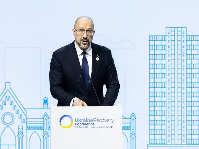 Ukrainian Prime Minister Denys Shmyhal delivers a speech during the Economic Forum official opening at the Ukraine Recovery Conference URC, in Lugano on July 5, 2022. - The URC is organised to initiate the political process for the recovery of Ukraine after the attack of Russia to its territory. (Photo by MICHAEL BUHOLZER / KEYSTONE / AFP) (Photo by MICHAEL BUHOLZER/KEYSTONE/AFP via Getty Images) / MICHAEL BUHOLZER
