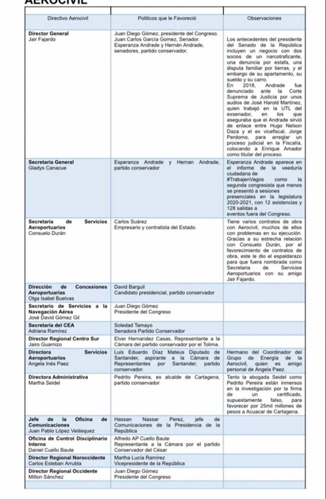 Pero no solo él, también están su secretaria general, Gladys Canacua, recomendada por Esperanza Andrade y Hernán Andrade, de ese mismo partido; la señora Consuelo Durán, secretaría de servicios aeroportuarios, quien habría sido favorecida por el empresario y contratista del Estado, Carlos Suárez y Olga Isabel Buelvas, de la dirección de concesiones aeroportuarias, quien habría llegado a la entidad de la mano de David Barguil, excandidato presidencial del Partido Conservador también.