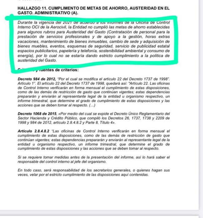 Otras de las posibles irregularidades que llamaron la atención de la Contraloría tienen que ver con el incumplimiento de las metas de ahorro y austeridad en el gasto administrativo al interior de la Aeronáutica Civil.